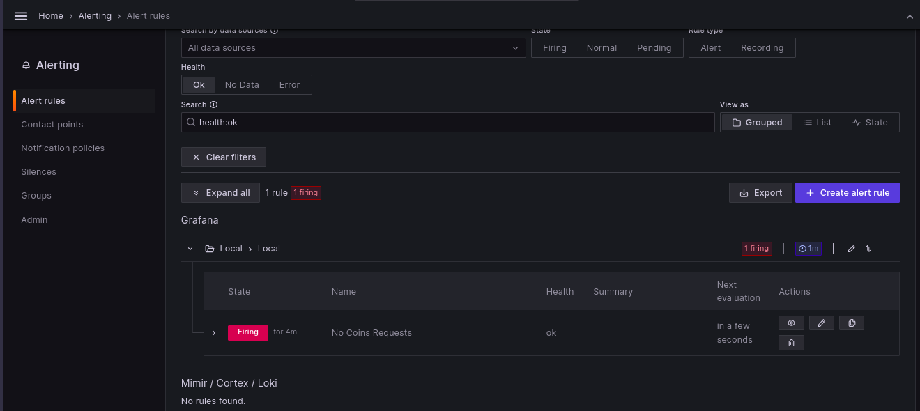 To establish allerts, identify a specific metric and create values for ok, warn, and error, as we do in other tools such as New Relic, DataDog, CloudWatch, and so on. This configuration may be found at http://localhost:9091/alerting.