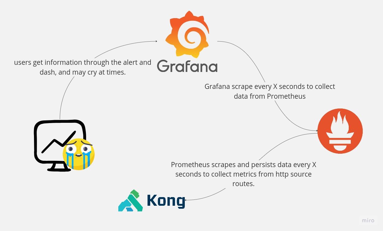 The drawings below show how metrics are translated to Dash and Alerts in Grafana using data that was initially created in Kong and set to Prometheus.